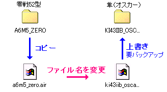 | 例えばAI機の隼に乗れるようにする際に、零戦のAIRファイル(***.air)を流用してしまう方法です。 ![]() 1: a6m5_zero.airをコピーし、Ki43iib_oscar.air と名前を変更します。 2: オリジナルのKi43iib_oscar.air の名前を変更し、バックアップしておきます。 3: Ki43iib_oscar.air をKI43UB_OSCARフォルダへコピーすれば完了です。 ※ この方法の場合、機体の説明欄にはコピーした機体の説明が表示されます。
