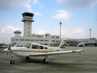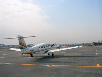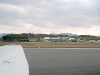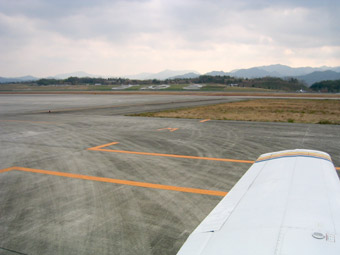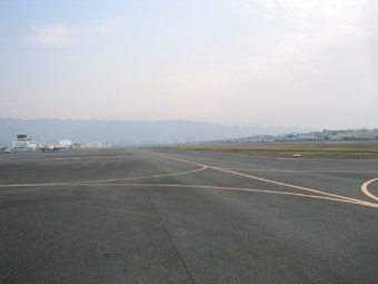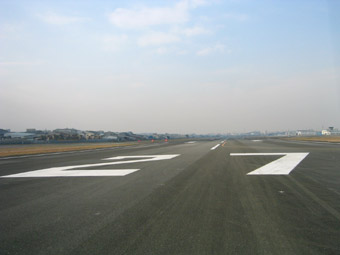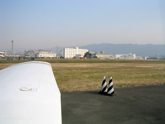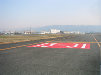 八尾空港ではRWY27に向かう途中、タキシーウェイがRWY13−31で突き当たりになって終わってしまいます。RWY27から離陸する機体はRWY13−31上に進入し、離陸前の点検を行います。 |