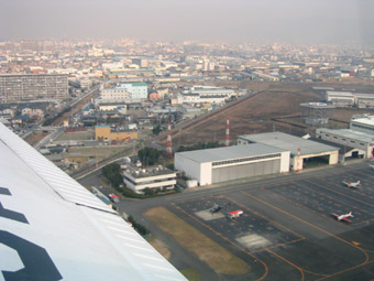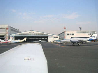 八尾空港の使用事業会社のハンガー郡の前を横切っていきます。翼端の先に見えるのは「朝日航空」のハンガーですね。 |