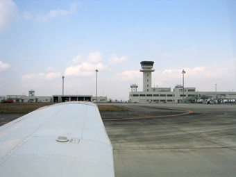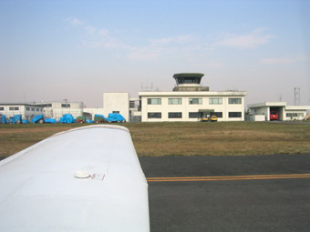 駐機場は管制塔の前になります。このあたりを左に曲がってっと。 |