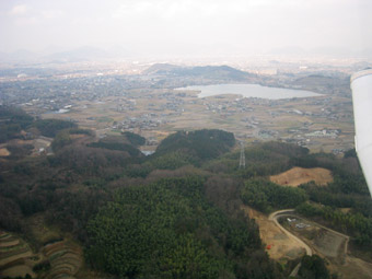 四国の山沿いを滑走路に向かって降下していきます。まだ滑走路は見えてきません。 |