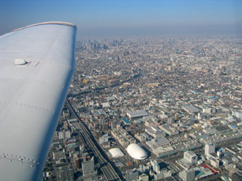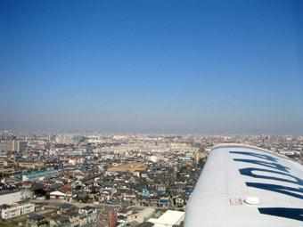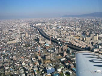 ちょうど近畿自動車道と阪神高速が交差する東大阪インターの真上です。下に見えている白いドームはゴルフの打ちっぱなし、翼の先端あたりには大阪市内の高層ビル群が見えています。