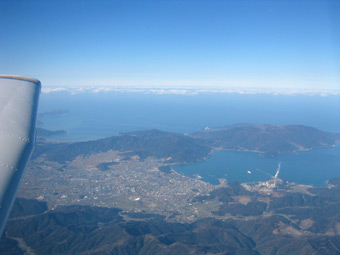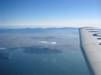 琵琶湖上空です。雲一つありません。気流も安定していて、非常に快適な巡航フライトです。琵琶湖の対面に見えているのは(ちょっと白い雲が見えている下あたり)が近江八幡です。 |