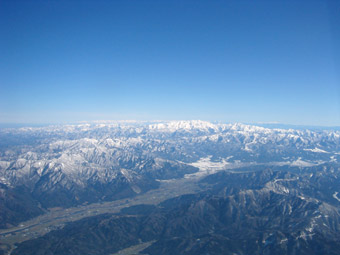 福井県の美山町のあたりです。我々の高度は9,500フィート、約3,200メートルですから、このあたりの山頂よりも倍以上の高度を飛行しています。それにしても山頂には雪が積もっていてとても綺麗ですよね。 |