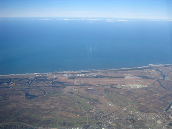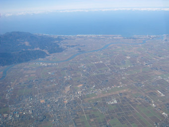 九頭竜川が日本海に流れ込んでいますね。手前には福井空港が見えています。分かります?ほら、道路と平行して田んぼの中を左右に延びている茶色いところ・・・ |