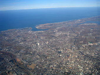 京都市上空です。街の中の大きな緑は京都御所。その左側の小さな緑の場所が二条城です。京都御所の手前の細い「筋」のように見えるのは鴨川です。 |