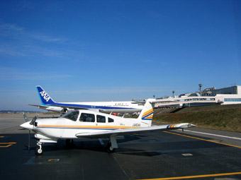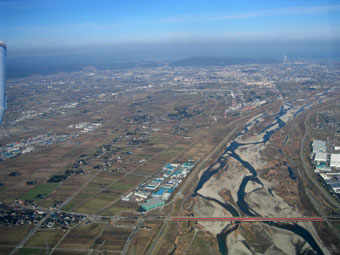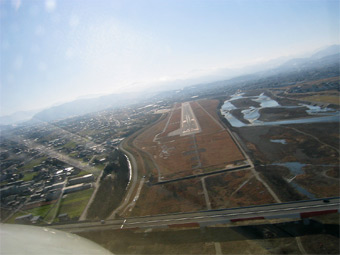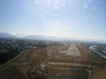 神通川の土手に作られたユニークな飛行場です。後続機を気にせずにゆっくりと駐機場まで向かいましょう。 |