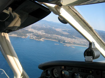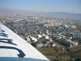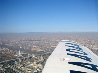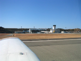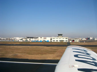 さて離陸です。八尾の管制塔が少しずつ離れていきます。 |