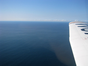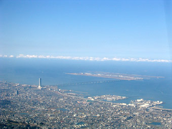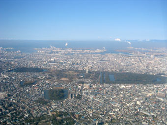中百舌鳥上空です。右側に見える大きな古墳は仁徳天皇稜、大仙公園も大きいですよね。また、大阪湾沿いの煙突からも煙が立ち上がっています。煙の流れ方かたすると、風は北西から吹いていますね。 |