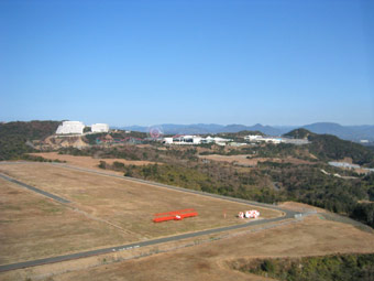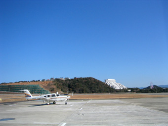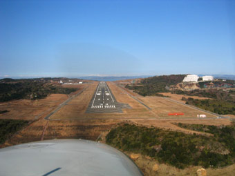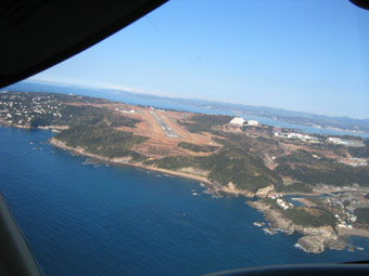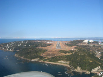南紀白浜空港です。滑走路の手前には旧南紀白浜空港の滑走路も見えています。間違えないように大きな黄色い×印が書いてありますけどね。 |