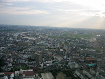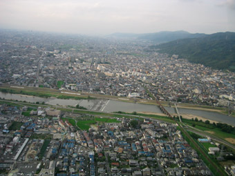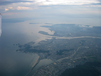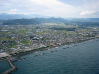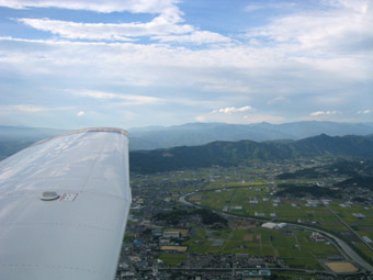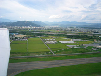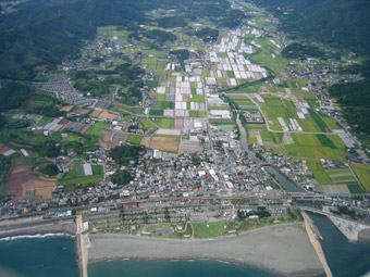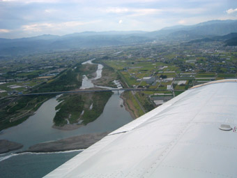 左を少し振り返ると空港の脇を流れる物部川。 |