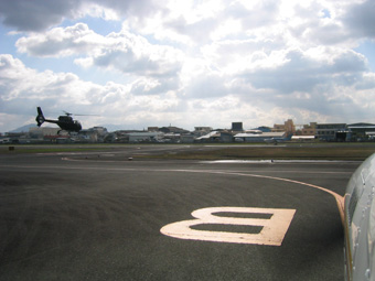 前方から黒色のジェットヘリコプターが離陸していきます。 |