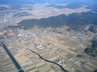 下のほうには田んぼっぽい物が見えています。