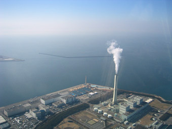 煙突から出ている煙はゆっくりと真上に上がっています。