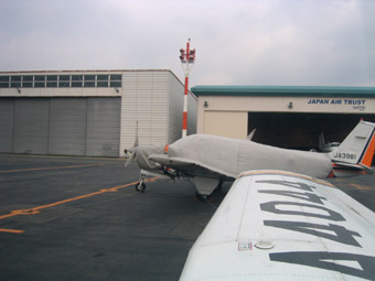 隣にも八尾から飛んできた小型機が留まっていますね。 |