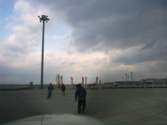 正面の人が両手を振って駐機場まで誘導して