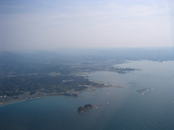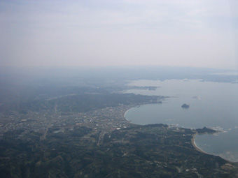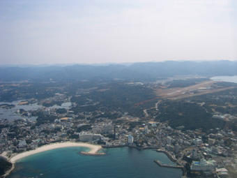 白い湾状の砂浜の向こうに滑走路が見えますか? |