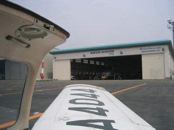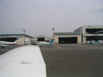 ハンガー群を左に見ながら滑走路までタキシング。 |