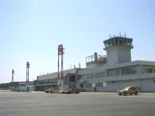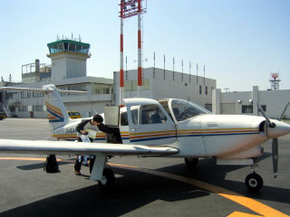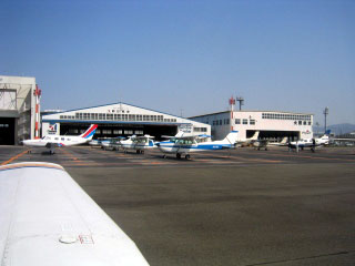 さて、約1時間45分のフライトを終えて到着しました。大分空港の管制塔の前に飛行機を駐機します。スポット番号2番です。 |