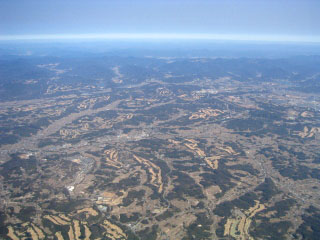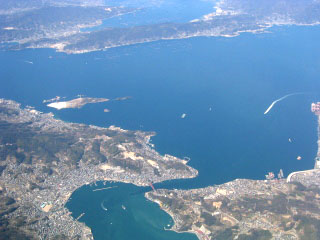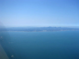 大分の半島が見えてきました。飛行場はどのあたりでしょうかね。 |