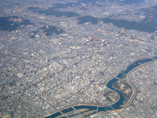 流れる川のすぐ右にある「公園」は有名な後楽園です。 |