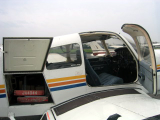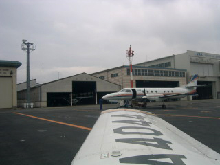 整備をお願いしている第一航空の左隣の「昭和航空」が所有しているちょっと大きめな多発プロペラ機。なにやら整備の方達が集まっていましたが。これから飛ぶのかな? |