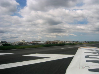 ゆっくりと滑走路に向かって誘導路を走行です。南の空は低い高度に雲が残っているものの、回復傾向ですね。