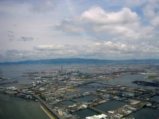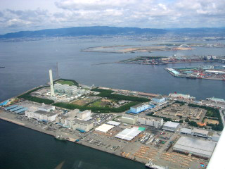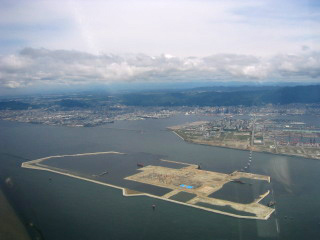 かなり埋め立てが完了してますね。ほぼ空港の形がイメージできますから。ポートアイランドへ横断する橋の足になる部分や、西からの進入灯が判別できます(写真左端)。 |