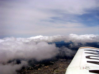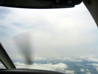 このあたりは大阪市内よりも雲が多いようです。写真は巡航高度へ上昇中で、ちょうど5,000フィートを通過している時です。雲も多いとは言え、5,000フィートで雲の上に出れる模様。 |