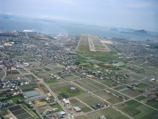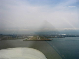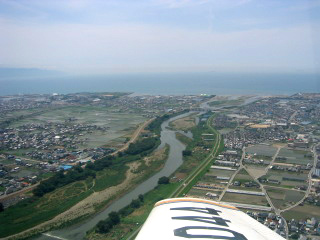 滑走路上を水平飛行してから右旋回。重信川を横断します。高度を上げて、Rwy14のライトダウンウィンドに入り、対策を考えましょう。 |