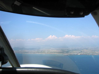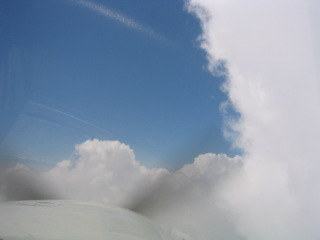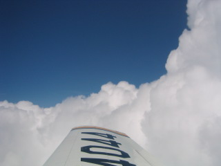 5,000フィート(約1,600メートル)でほぼ雲から出てきました。雲の厚みは2,000フィートくらいでしたね。それにしても積乱雲系がモクモクしていますわ。夕方なら雷雨とかの可能性もあって大変だったでしょうが、今は朝ということで積乱雲もおとなしい〜。 |