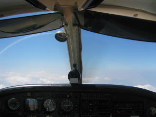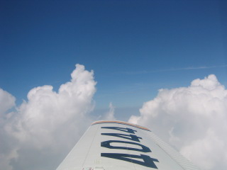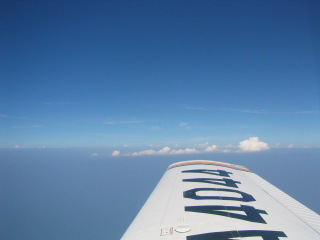 巡航高度の8,000フィートに到達しました。この高度であればどの雲よりも上を飛行しているので問題ありません。ここまでくれば視程も抜群!空も目が痛くなるような青です。 |
