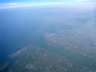 和歌山沖までやってきました。我々にも降下の指示です。遠くに見える地平線のようなもの・・・あれは地平線ではないんです。今日は低い高度では視程が悪く、ガスっている感じでして、上のガスっていない空と、ガスっている下の空気の境目が地平線の様に見えるのです。