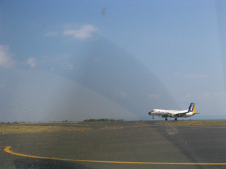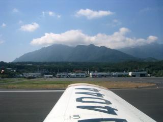 屋久島の山をバックにターミナルビルが見えています。ゆっくりと離陸する滑走路の端までタキシングしましょう。先ほど着陸したYS-11は我々の後ろをエプロンに向かってゆっくりと走ってきています。 |