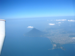 左側には開聞岳が見えています。とがっていて面白いですよね。写真の右端から切れて見えませんが、指宿温泉もこのあたりです。 |