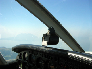 レーダーで誘導されながら鹿児島空港の計器進入に入ります。飛行機の左側には桜島が見えています。 |