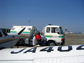 さて、そもそもの目的の給油の為に燃料屋さんに来てもらいました。八尾に帰るのに十分な燃料を補給しましょう。ついでに鹿児島空港でお昼ごはんといたします。やっぱり黒豚のトンカツですか? |