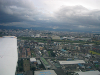 大和川と平行に離陸します。金剛山は見えているので視程は悪く無いですが、雲が多くて空が暗いですね〜 |