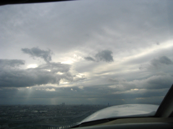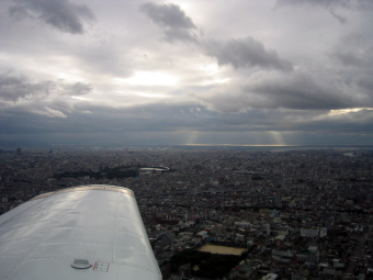 西の空には大阪湾に雲の合間から日が差し込んでいます。青空の時も綺麗ですが、この景色も神秘的ですよね。翼の先に見えるのは長居球場です。 |