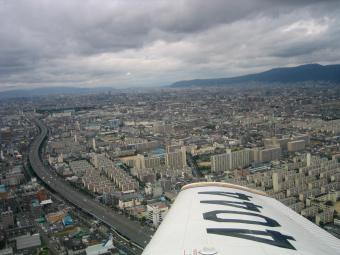 六甲アイランドです。右下から中央に伸びる道は六甲大橋と六甲ライナーです。緑に囲まれた人工島です。今日は北風の関係で「六甲降ろし」が機体を少し揺らせています。 |