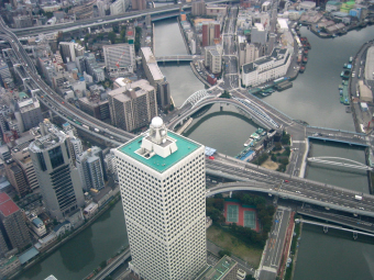中ノ島上空です。中央少し下の薄い茶色のビルが大同生命。その直ぐ左上が朝日新聞です。朝日新聞の左に立つ高層ビルが大手繊維会社の東レ新社屋ですね。ちなみに、右上の方には茶色い「丸ビル」が見えています。 |