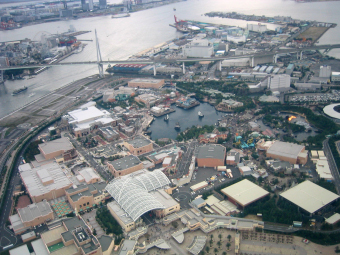 ユニバーサル・スタジオ・ジャパン、通称「USJ」の上空です。右のオレンジ色の炎は「JAWS」のライドでしょうね。駐車場は車で満杯。 |