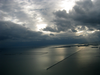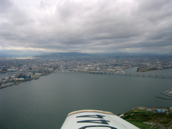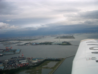 大阪湾上空を西に見ました。写真中央の黒い島はポートアイランド。 |
