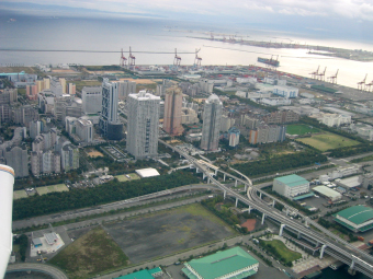 右は大阪WTCビル「コスモタワー」、中央下はスポーツ用品メーカーのミズノ社屋、それらの間に挟まれてハイヤット・リージェンシー・大阪。 |