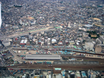 平野にあるJR関西本線(大和路線)の車庫でしょうか。JRの青と茶色のコンテナが沢山並べられています。電車の車庫の上にみえる肌色の長い屋根は「中央卸売市場東部市場」です。 |