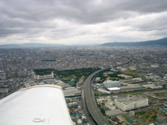 さてさて、出発の時に横断した近畿道まで戻ってきました。翼の先には久宝寺公園も見えています。 |