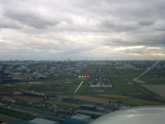 八尾のRWY27です。滑走路左脇の照明が進入角度を示しています。左側が白灯2個、右側が赤灯2個ですね。進入角度が適切ということです。 |