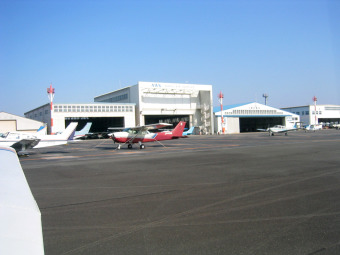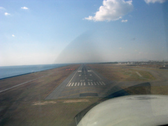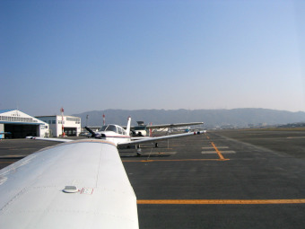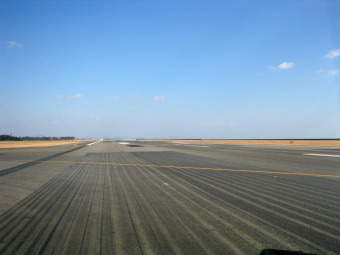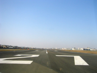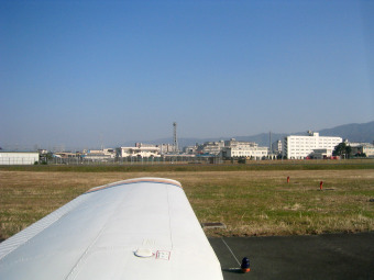 八尾空港のRWY27(方位270度に向いている滑走路)から離陸するためには、一旦RWY13−31に入ってこの位置で離陸前の点検、プリ・テイクオフ・チェックを行います。 |
