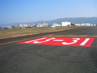 去年の11月あたりから滑走路手前の停止位置線にペイントされている赤いマーキング。「13−31」は滑走路の13と31(同じ滑走路で進行方向が双方向)の意味。方位130度と310度を向いている滑走路ということです。 |