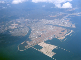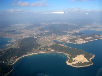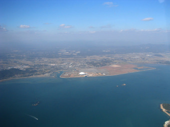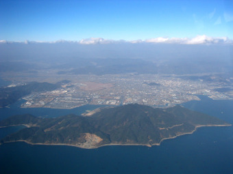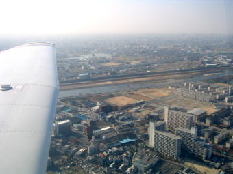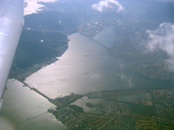 岡山上空です。中央の川に沿って岡南空港が見えています。 |